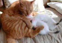 Pappa, un po' di toeletta e finalmente la nanna. Così anche mamma gatta può finalmente rilassarsi.