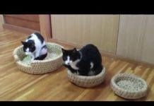 Un gatto e tre cucce. Quale sceglierà? Quando sembra essere convinto però arriva il suo amico e deve didiverla con lui.