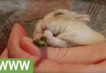 Il piccolo cricetino è molto stanco e, mentre mangia, crolla tra le braccia di Morfeo.
