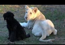 Un piccolo cucciolo di leone e uno di cane. Non importa se appartengono a due razze diverse. A loro piace giocare insieme.