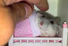 Questo criceto riesce ad addormentarsi solo se la sua padrona gli fa un tenero massaggio mentre lui se ne sta comodamente nel lettino sotto...