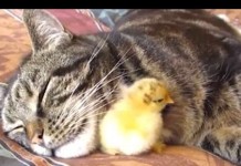 Mamma gatta prende sotto la sua "ala protettrice" un tenero pulcino e due adorabili coniglietti. Sembrano veramente suoi figli da tanto che li accudisce.