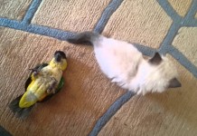 Ma quanto si divertono a giocare insieme quel piccolo pappagallino e il suo amico gatto?