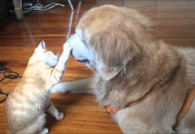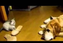 Il gattino vede gli occhi del suo amico cagnone muoversi e non ci pensa un attimo a balzargli addosso.