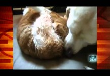 Un’ostetrica veramente singolare: un cagnolone aiuta mamma gatta a partorire.