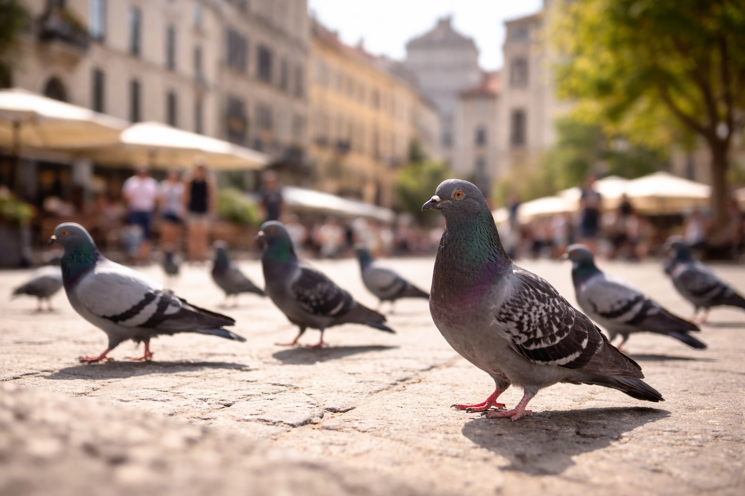 A differenza di altri uccelli urbani, i piccioni non evitano del tutto la presenza umana. Le superfici aperte delle città – piazze, marciapiedi, scalinate – sono spazi ideali per muoversi e controllare l’ambiente.